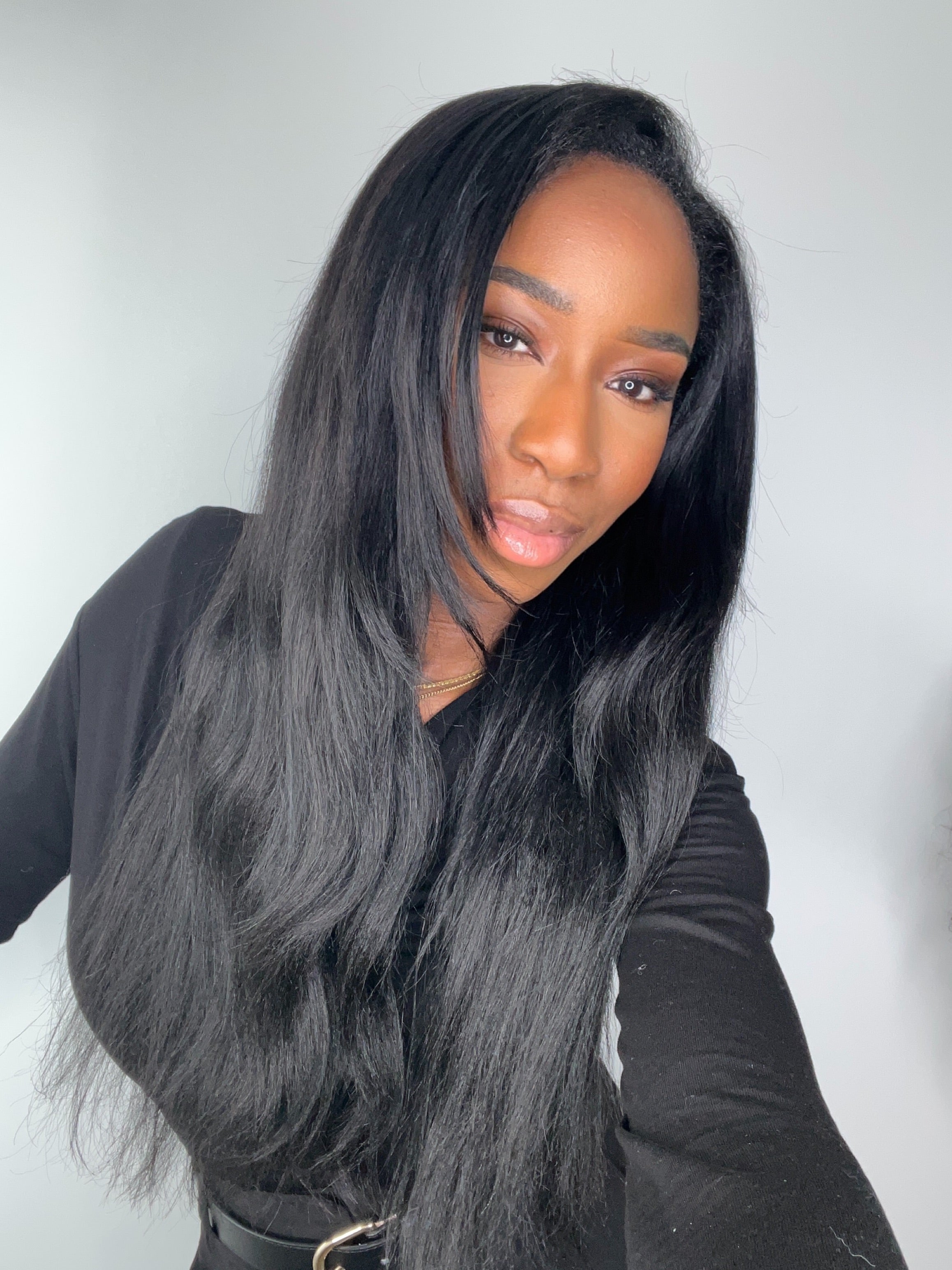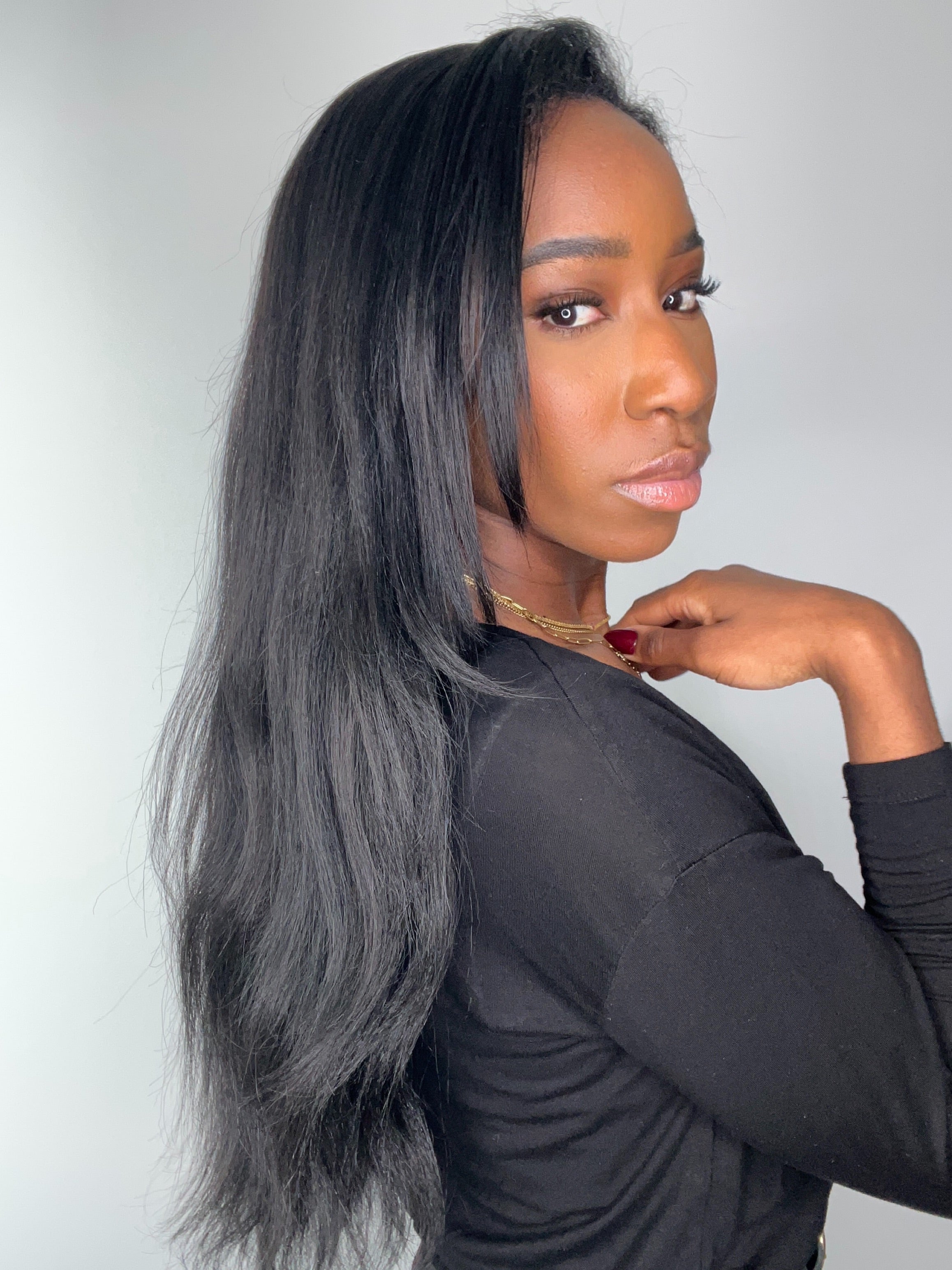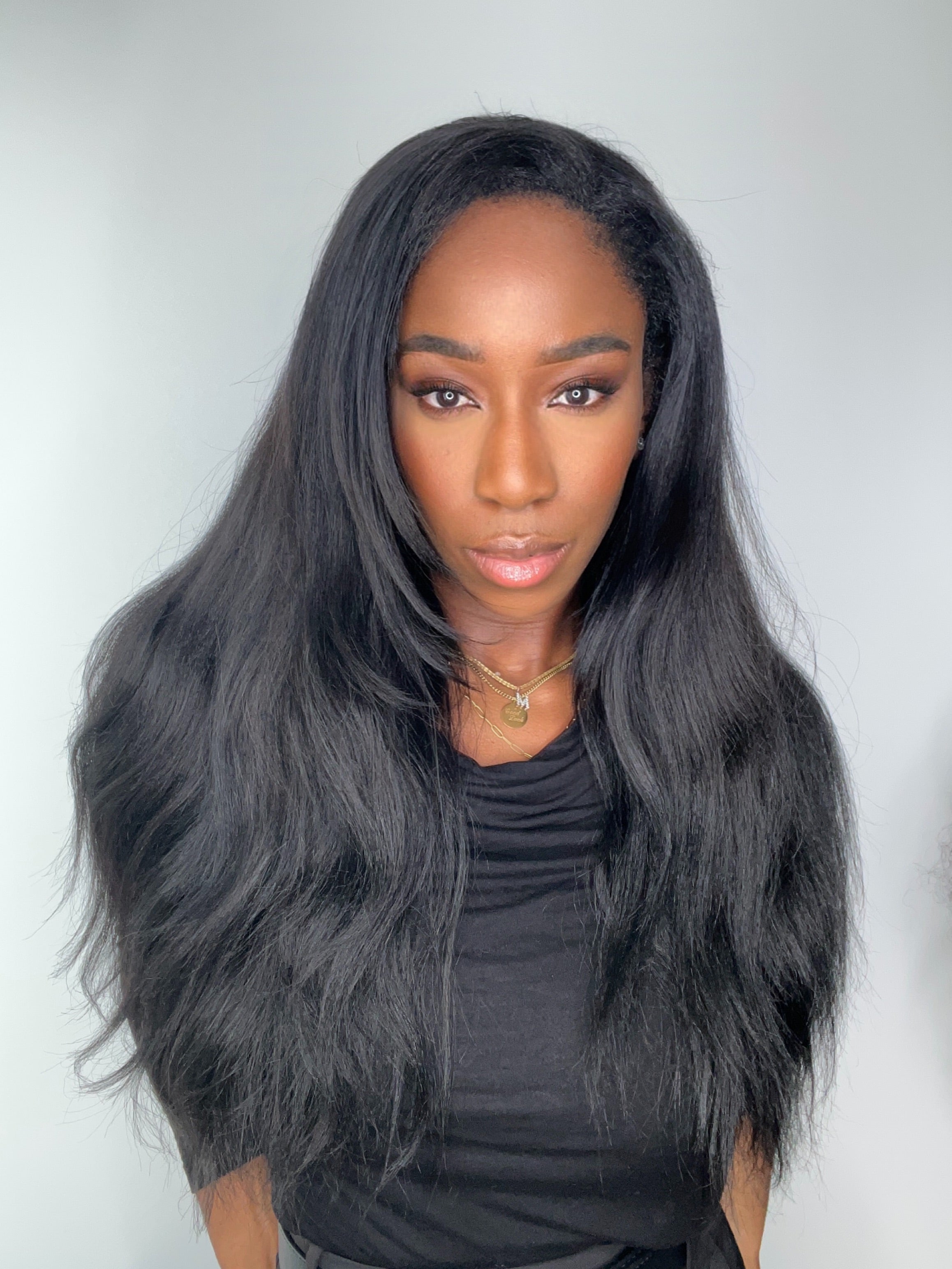 La perruque YARA est confectionnée avec des mèches yaki straight, imitant à la perfection l’effet des cheveux lissés au fer ou d’un silk press sur cheveux texturés. Elle est fluide, douce et soyeuse, tout en conservant une légère épaisseur et du mouvement.