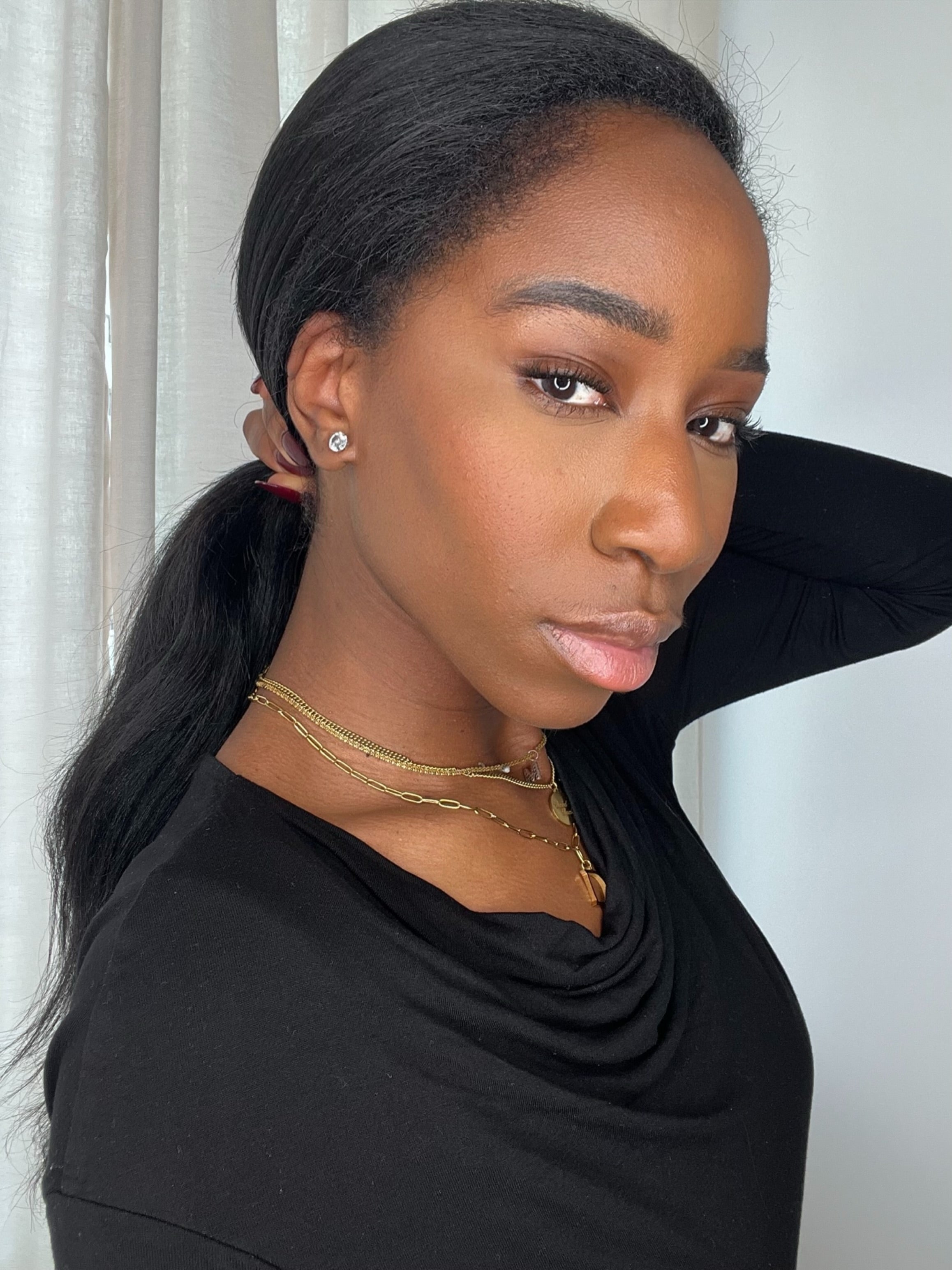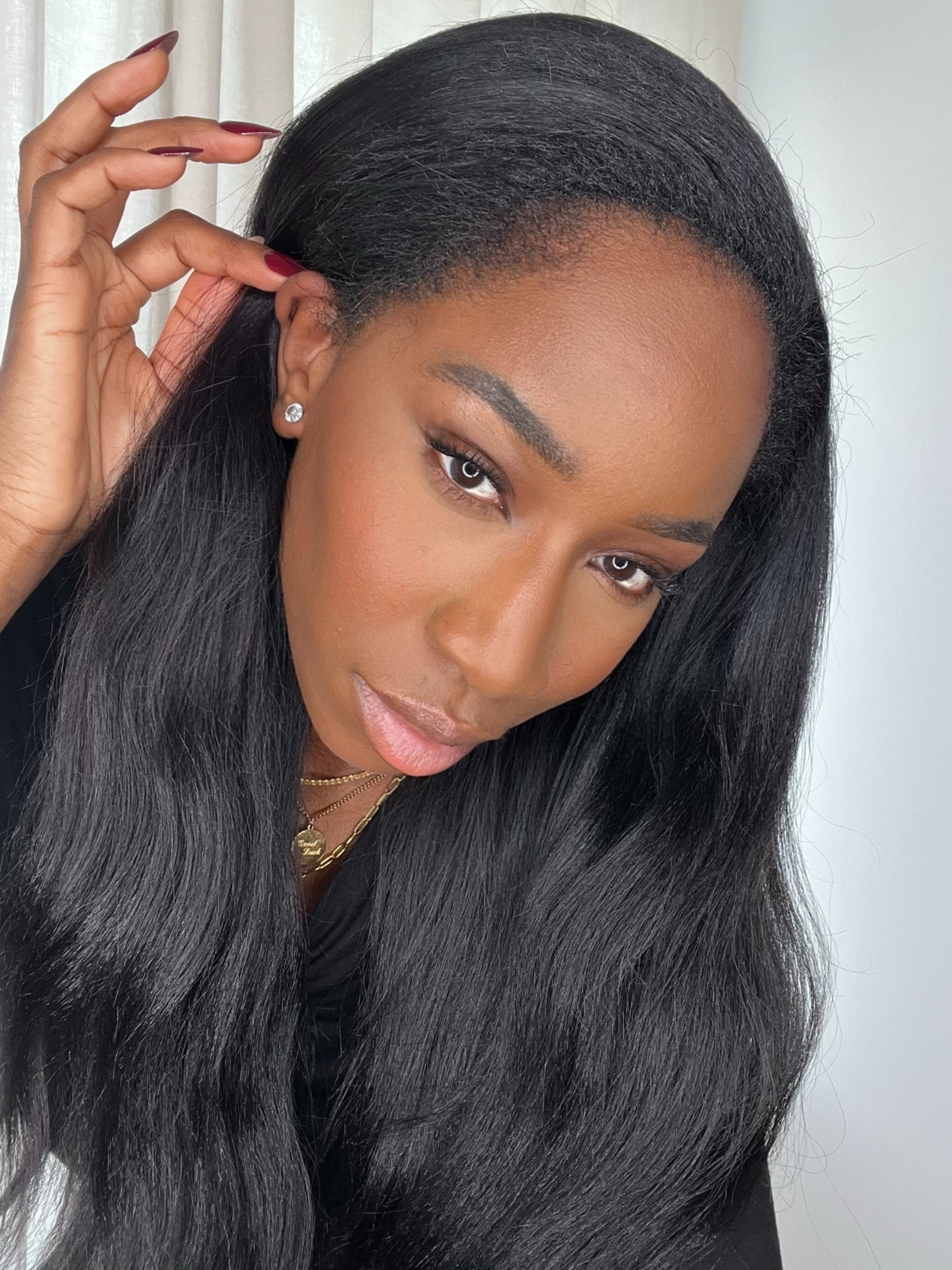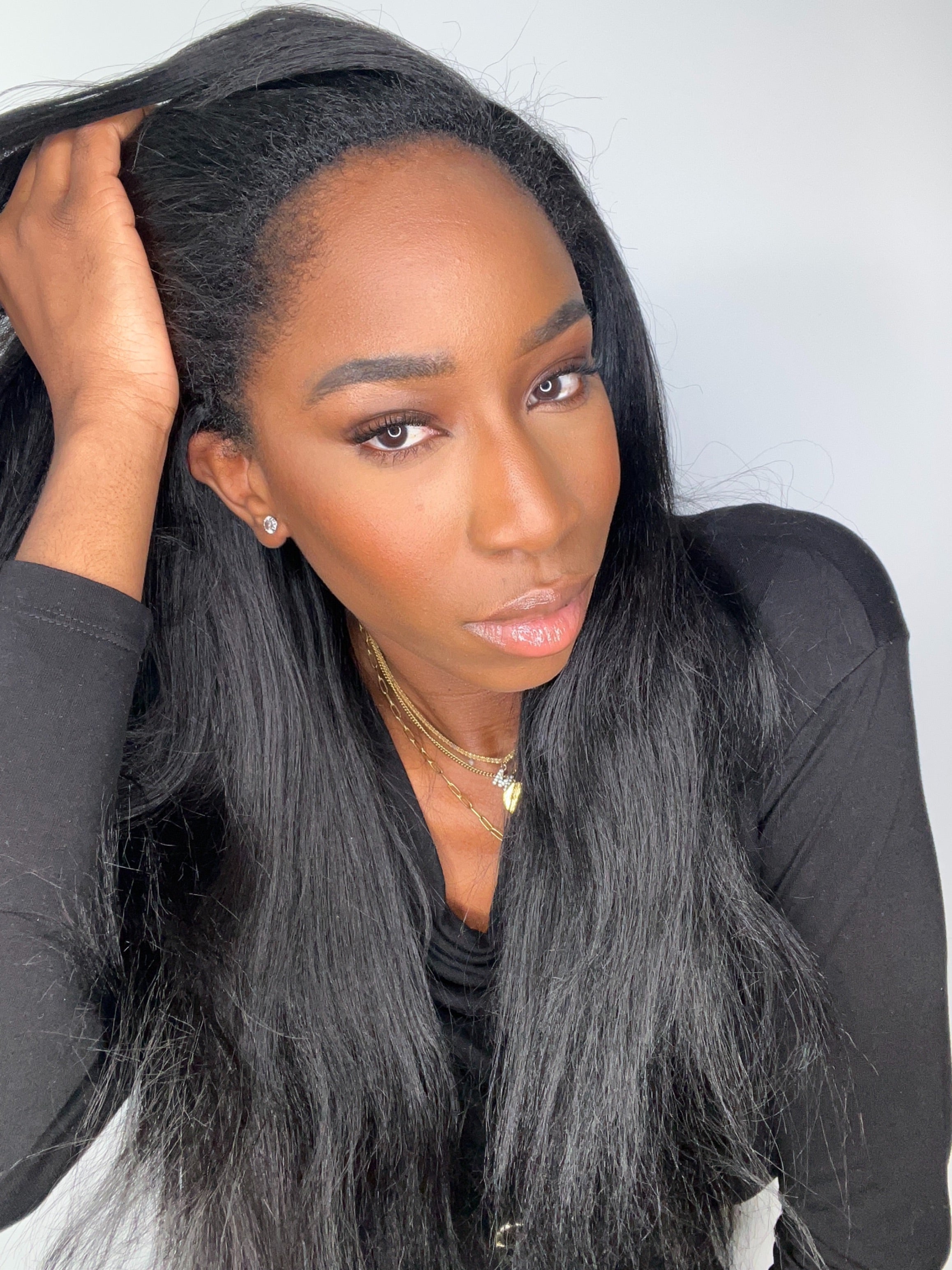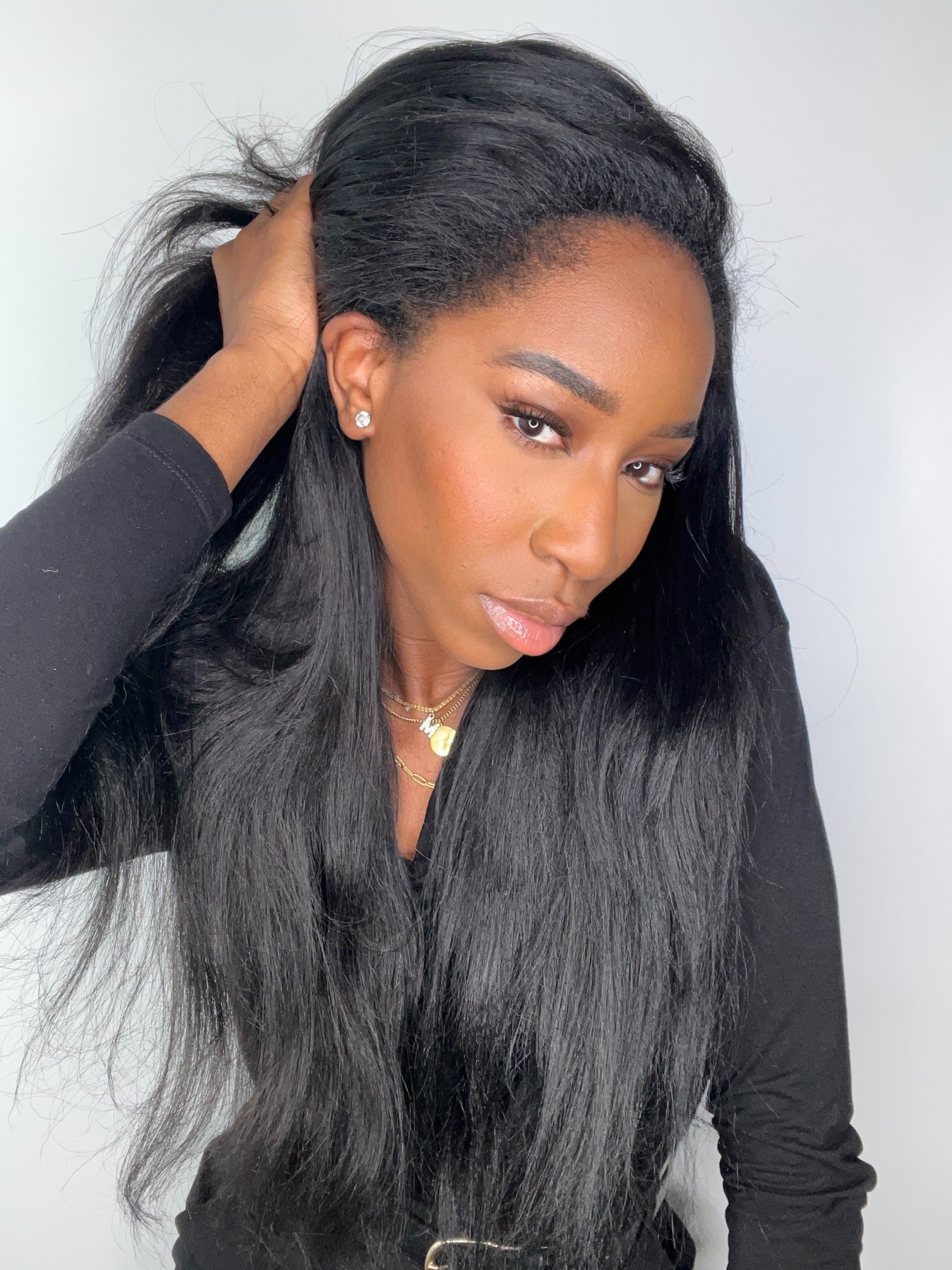 La perruque YARA est confectionnée avec des mèches yaki straight, imitant à la perfection l’effet des cheveux lissés au fer ou d’un silk press sur cheveux texturés. Elle est fluide, douce et soyeuse, tout en conservant une légère épaisseur et du mouvement.